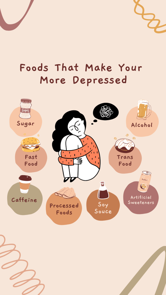- Sugary Foods and Drinks: High sugar intake can lead to spikes and crashes in blood sugar levels, affecting mood stability and energy levels. Frequent consumption of sugary foods like candies, pastries, and sugary drinks can increase the risk of depression.