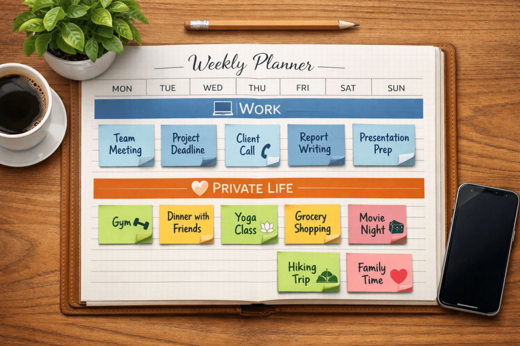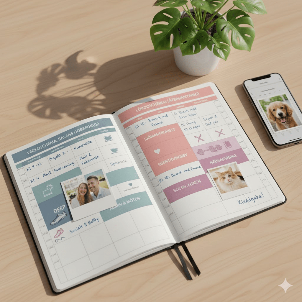 Att balansera jobb och privatliv handlar inte bara om att hinna med allt, utan om att faktiskt ha energi kvar när arbetsdagen är slut. Här är ett förslag på ett strukturerat veckoschema. Jag har lagt in ”block” för att göra det överskådligt, men du kan självklart flytta runt dem så de passar dina tide